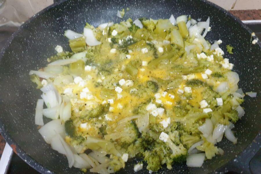 טורפים את הביצים בקערית, מוסיפים את הגבינה הבולגרית ויוצקים מעל פרחי הברוקולי.